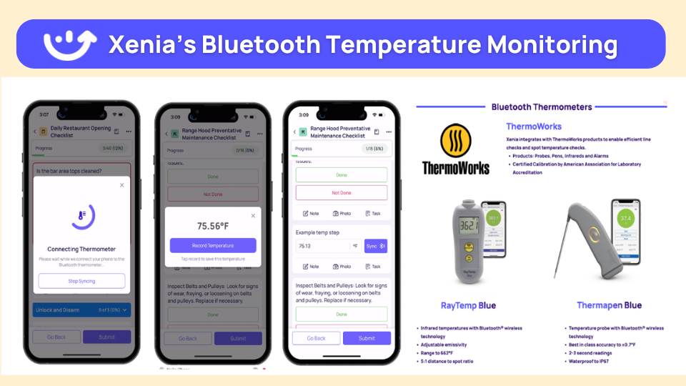 Xenia automates everything. Bluetooth thermometers sync line check temps instantly. Wireless sensors monitor refrigeration 24/7. Managers get alerts when temps drift. Corrective actions trigger automatically.