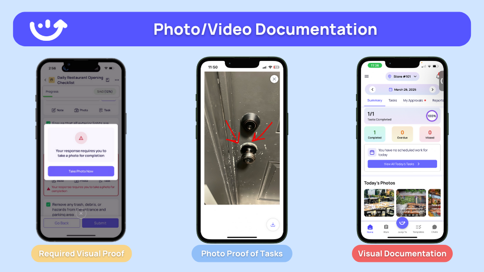 The new way? Your team snaps photos during morning tasks. AI checks compliance in 30 seconds. You're fixing issues before lunch.