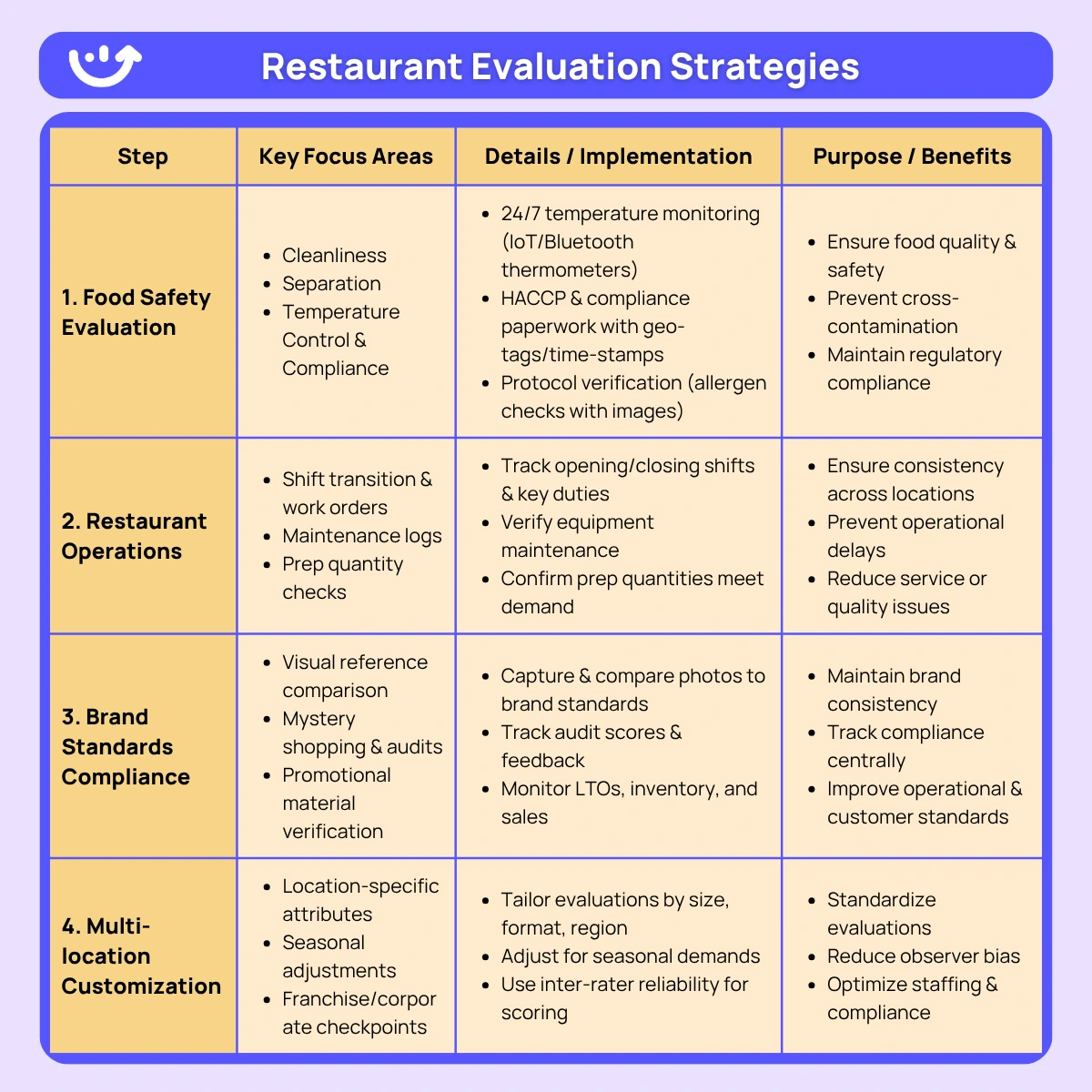 Restaurant quality evaluations should be consistent and efficient for all locations, and here’s a three-step approach you can follow:
