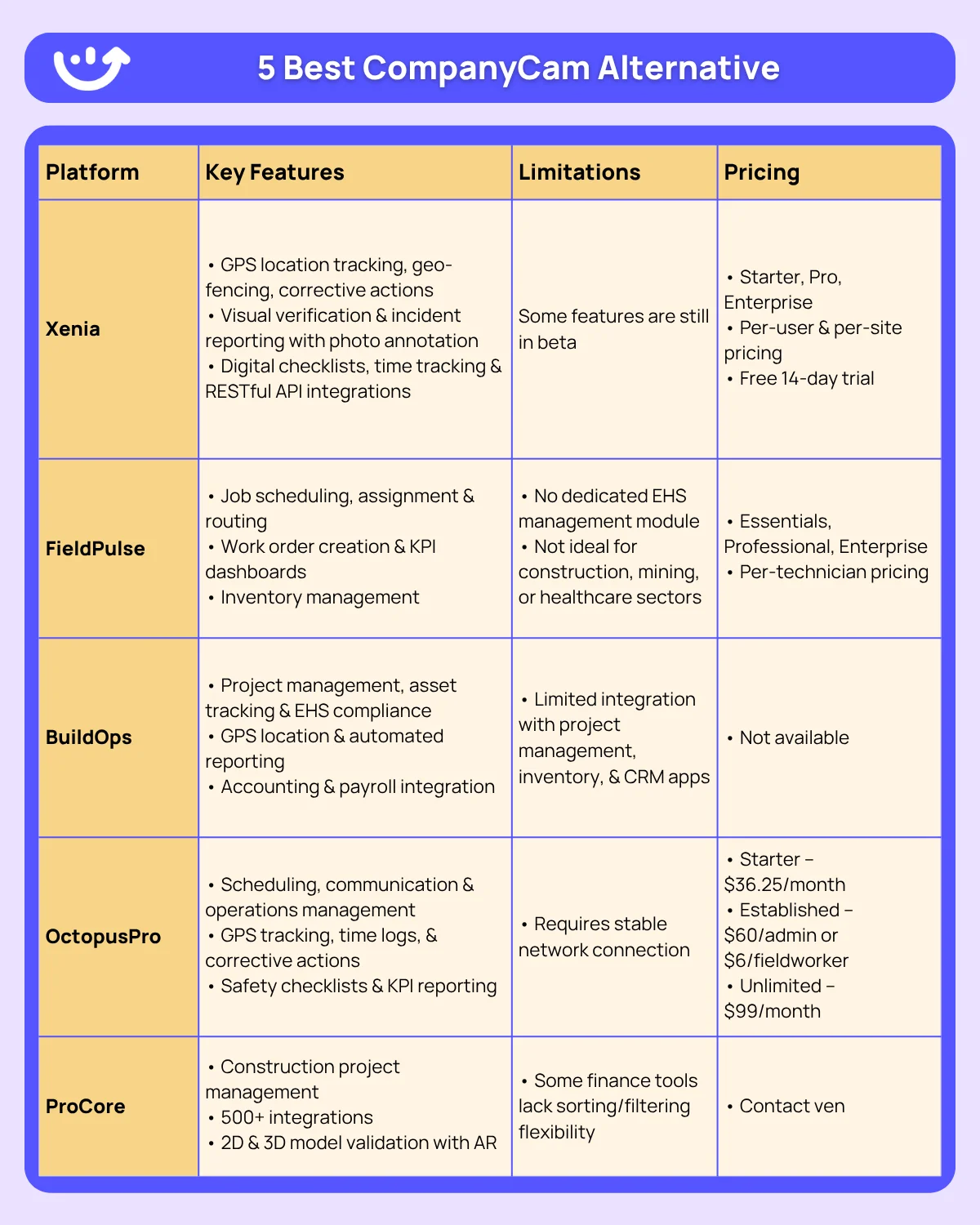 While several platforms aim to support field operations, Xenia stands out as the most comprehensive alternative to CompanyCam. With real-time task tracking, photo and video verification, and mobile-first workflows, it streamlines frontline operations end-to-end.