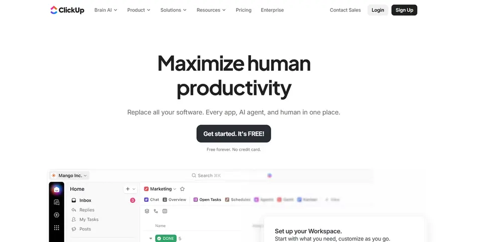 ClickUp is a project management software that helps teams manage tasks, documents, workflows, and chats in one place. With ClickUp, you can organize teams by breaking down tasks into lists and spaces, and maintain a clear hierarchy of all your work.