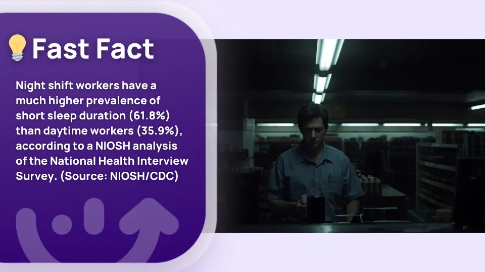 According to a NIOSH analysis of the National Health Interview Survey, 61.8% of night shift workers reported short sleep duration, compared to 35.9% of daytime workers. The same study found that rotating shift workers had significantly higher rates of prolonged sleep-onset latency than day workers, meaning they took 30 or more minutes just to fall asleep.