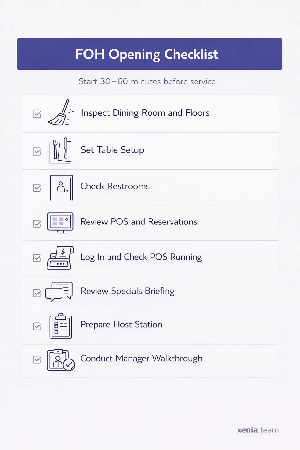 Use this free template to get started: FOH Opening Checklist