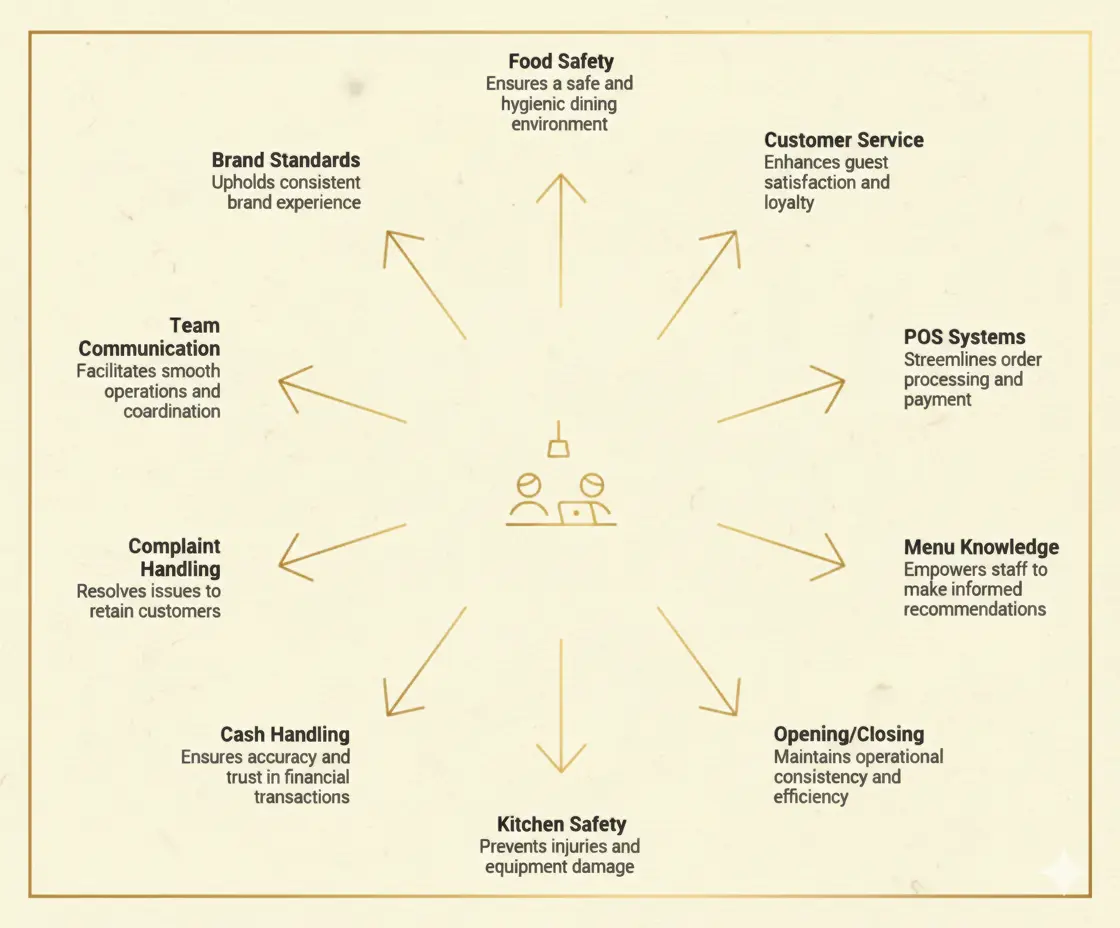 Start with food safety and customer service. These directly impact guest safety and satisfaction. Then add POS operation, menu knowledge, and opening/closing procedures.