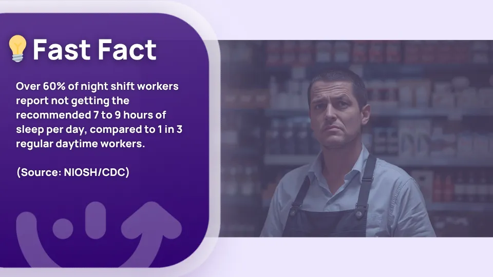Research consistently links rotating shift work, particularly night shifts and backward rotations, to disrupted circadian rhythms and sleep deficit. Over 60% of night shift workers do not get the recommended 7 to 9 hours of sleep per day.