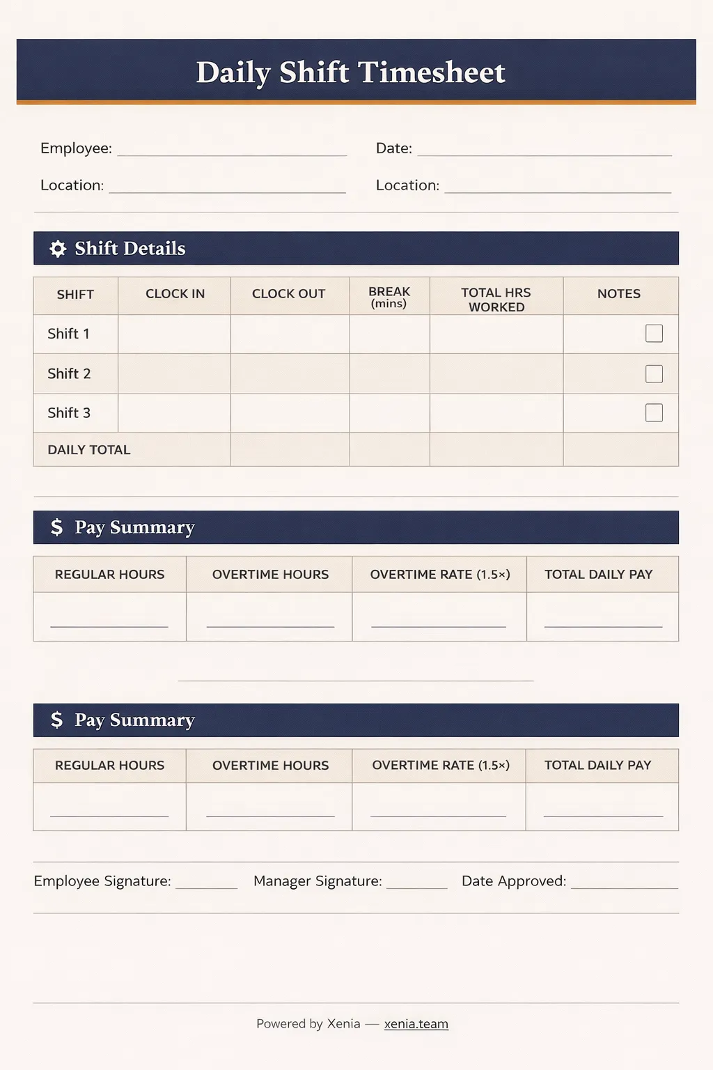Two fields that generic templates almost always miss: location worked and manager approval status.