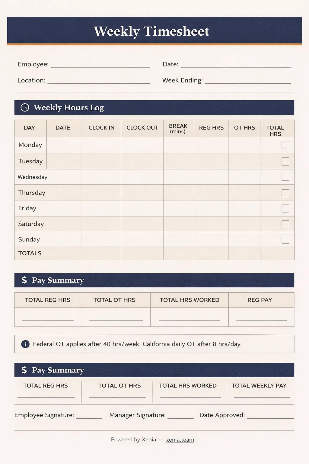 A weekly timesheet covers a standard Monday-to-Sunday workweek and totals all shift hours across that period. It aligns with the FLSA's workweek definition, which makes overtime tracking clean. Any employee who breaks 40 hours owes overtime, and the weekly total makes that visible before payroll runs.