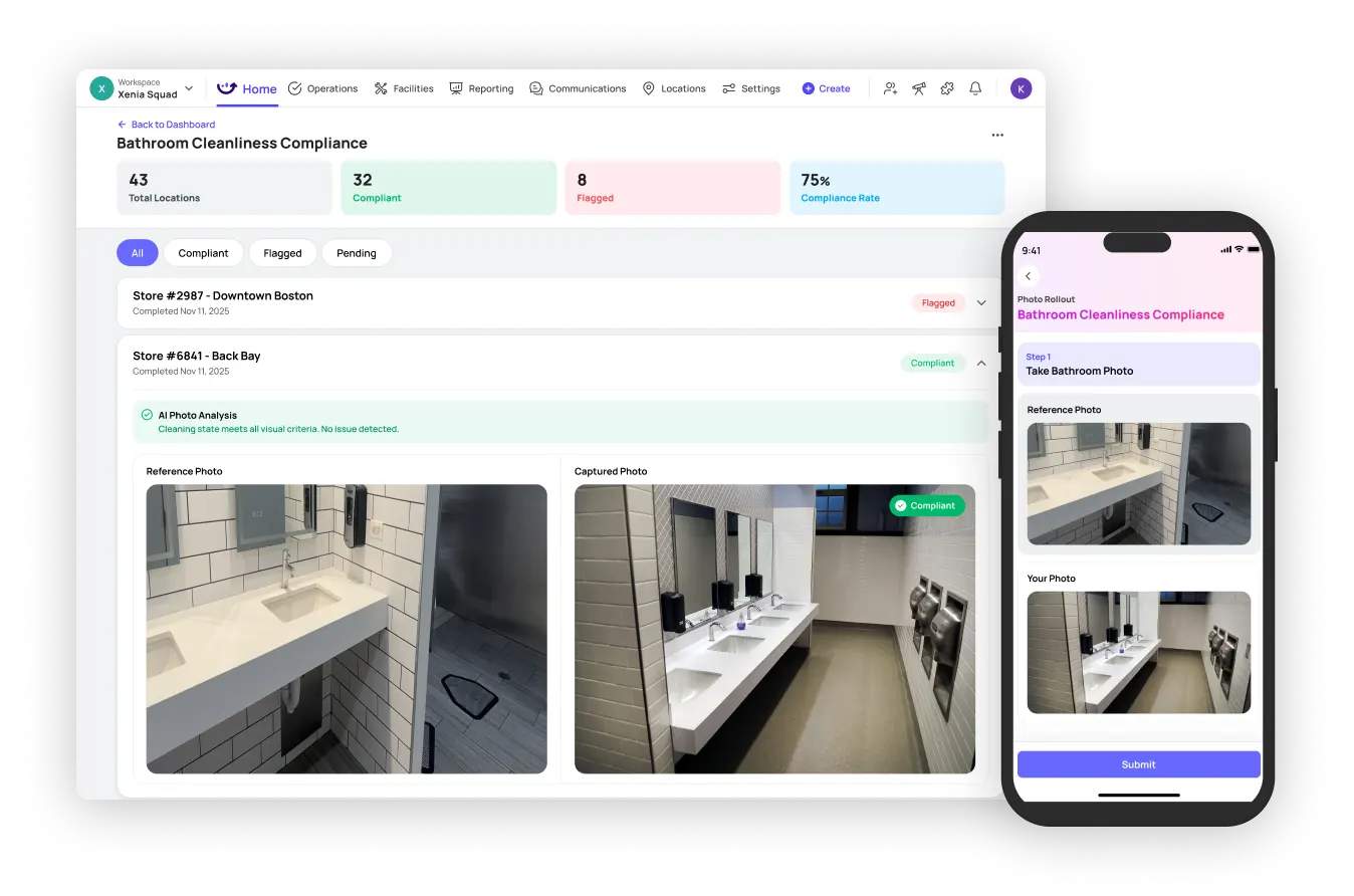 AI Photo Rollouts: Stop guessing whether standards are being met. Point your phone, snap a photo, and AI instantly verifies everything from equipment placement to signage compliance to repair completion. No more "I think it looks right" or discovering issues during audits. Every check becomes objective, documented proof that protects your brand.