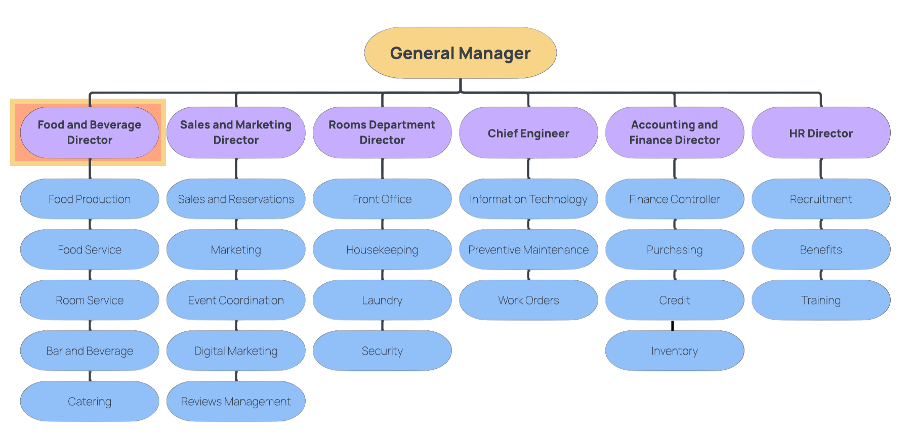 The Hotel Food and Beverage Director oversees all operations related to the planning, preparation and success of food and beverage operations within a hotel. This includes restaurant operations as well as other services such as catering, bar, and room service. The Food and Beverage Director reports directly to the General Manager and oversees the food and beverage shift workers.