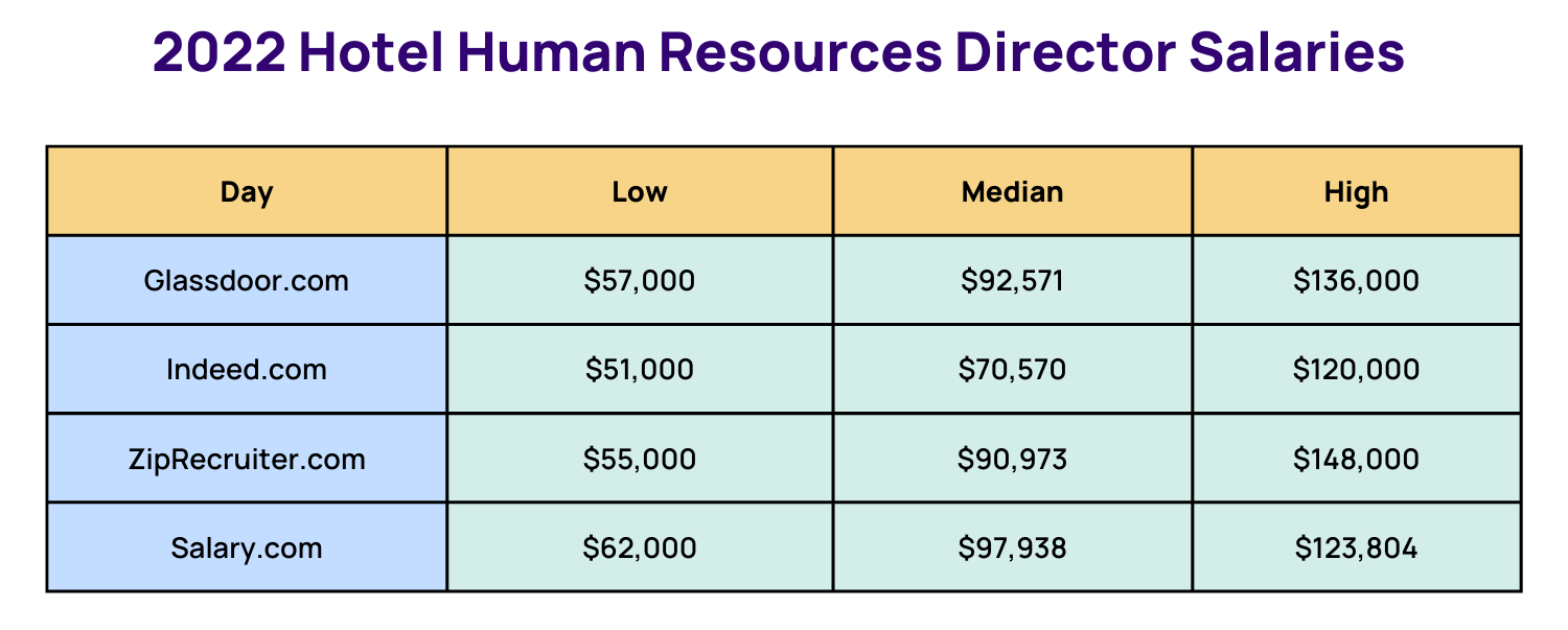 There are many more factors that contribute to salary data variation, so most sites provide salary information in a range to ensure that there is proper coverage. The table below shows the latest salary ranges for Hotel HR Director's across the major salary reporting platforms: