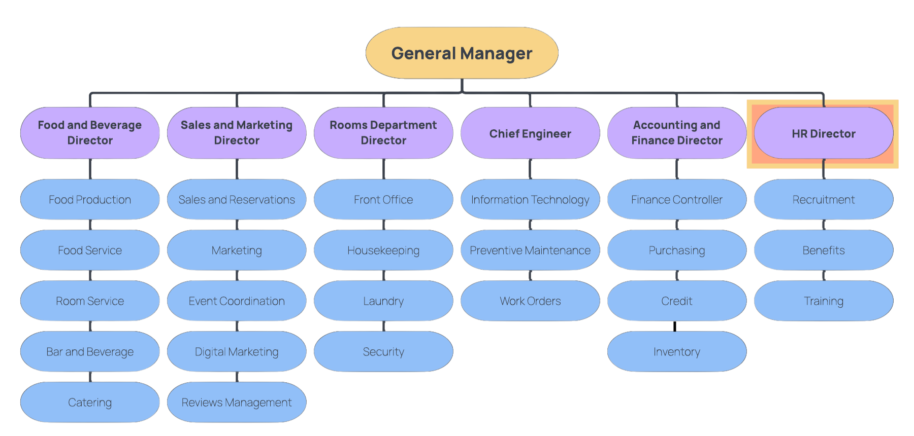 A Hotel Human Resources Director oversees staff related operations including recruiting, onboarding, benefits, compliance, employee relations, workforce planning, wage decisions and more. Human Resources is the go to department for employee complaints, issues and questions. The Human Resources Director typically reports directly to the General Manager of a hotel.