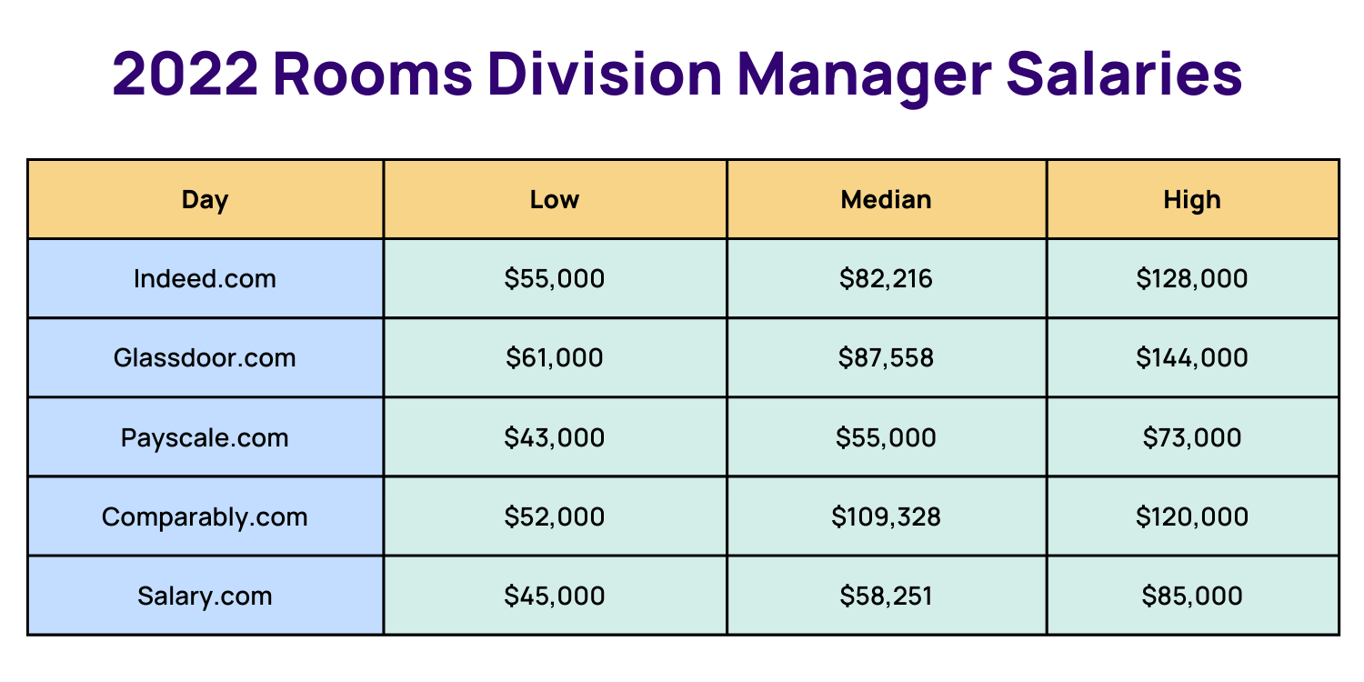 There are many more factors that contribute to salary data variation, so most sites provide salary information in a range to ensure that there is proper coverage. The table below shows the latest salary ranges for rooms division manager's across the major salary reporting platforms: