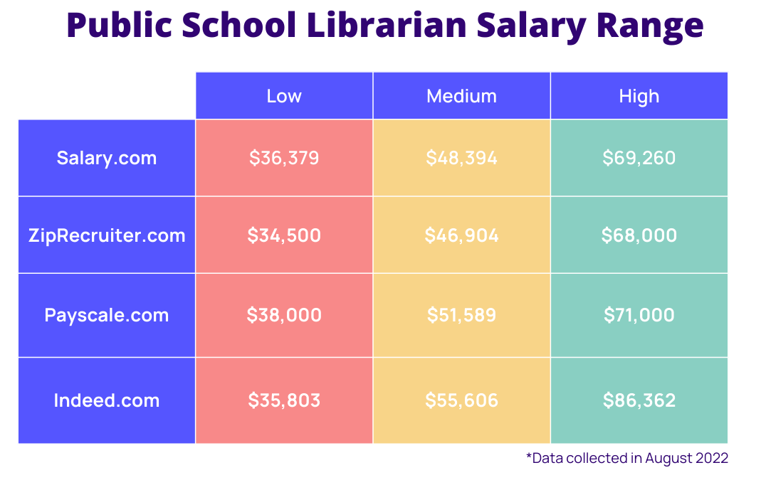 Below is a schedule of school librarian salary ranges from leading websites:
